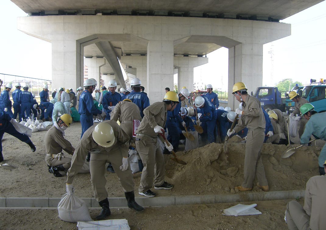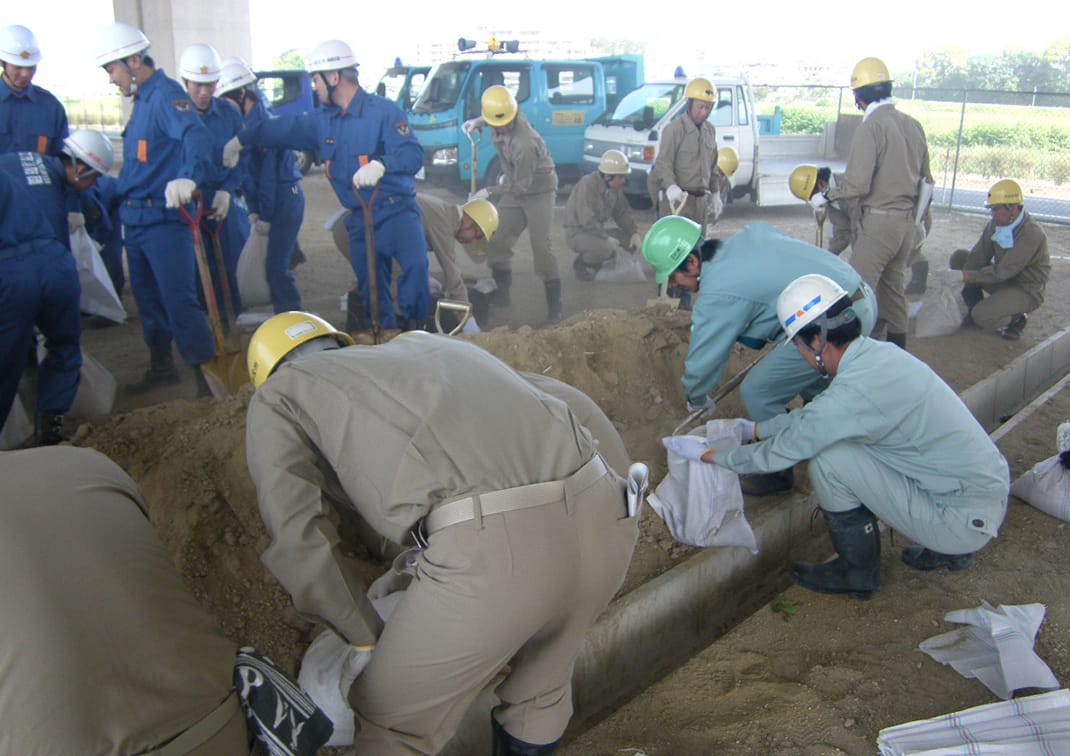 知立市主催の防災訓練で、住民や消防団のみなさんと私たち建設業者が力を合わせて土のうを製作します。土のうとは堤防の決壊箇所に積み上げられ、浸水を防ぐために使用します。記憶に新しいのは、タイの洪水で使われていたことでしょう。ただし、あくまでも緊急の場合に使用するのであって、基本的にはしっかりした治水対策を行う必要があります。余談ですが、治水対策ではオランダが有名です。事実、木曽三川分流工事では、オランダの技術者たちの尽力がありました。